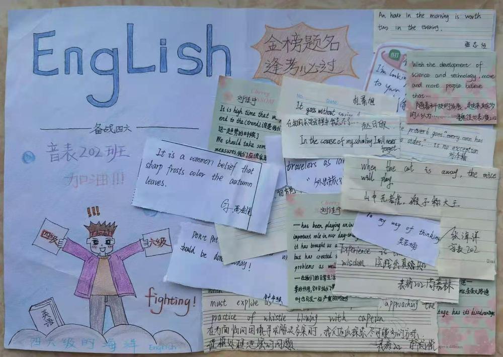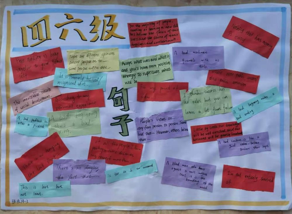 为激发同学们的学习热情,备战四级考试,在四六级经验交流分享会结束后,公司团委发起了征集四级写作句子手抄报活动。同学们踊跃参加,并将这份热情投入到备战英语四级考试的复习中。截至11月22日共征集到来自30班的30个作品。